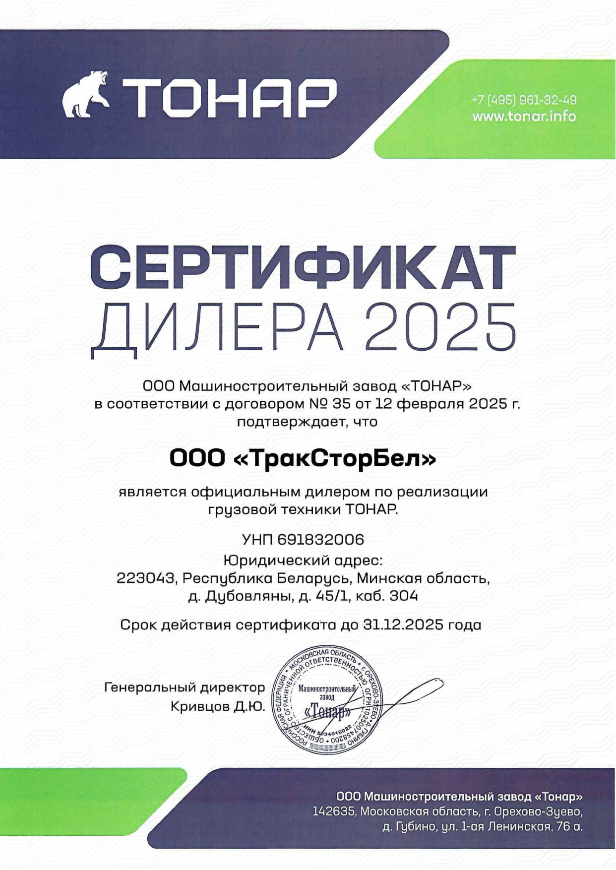ООО "ТракСторБел" - официальный дилер ТОНАР в Республике Беларусь www.тонар.бел